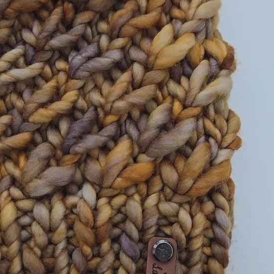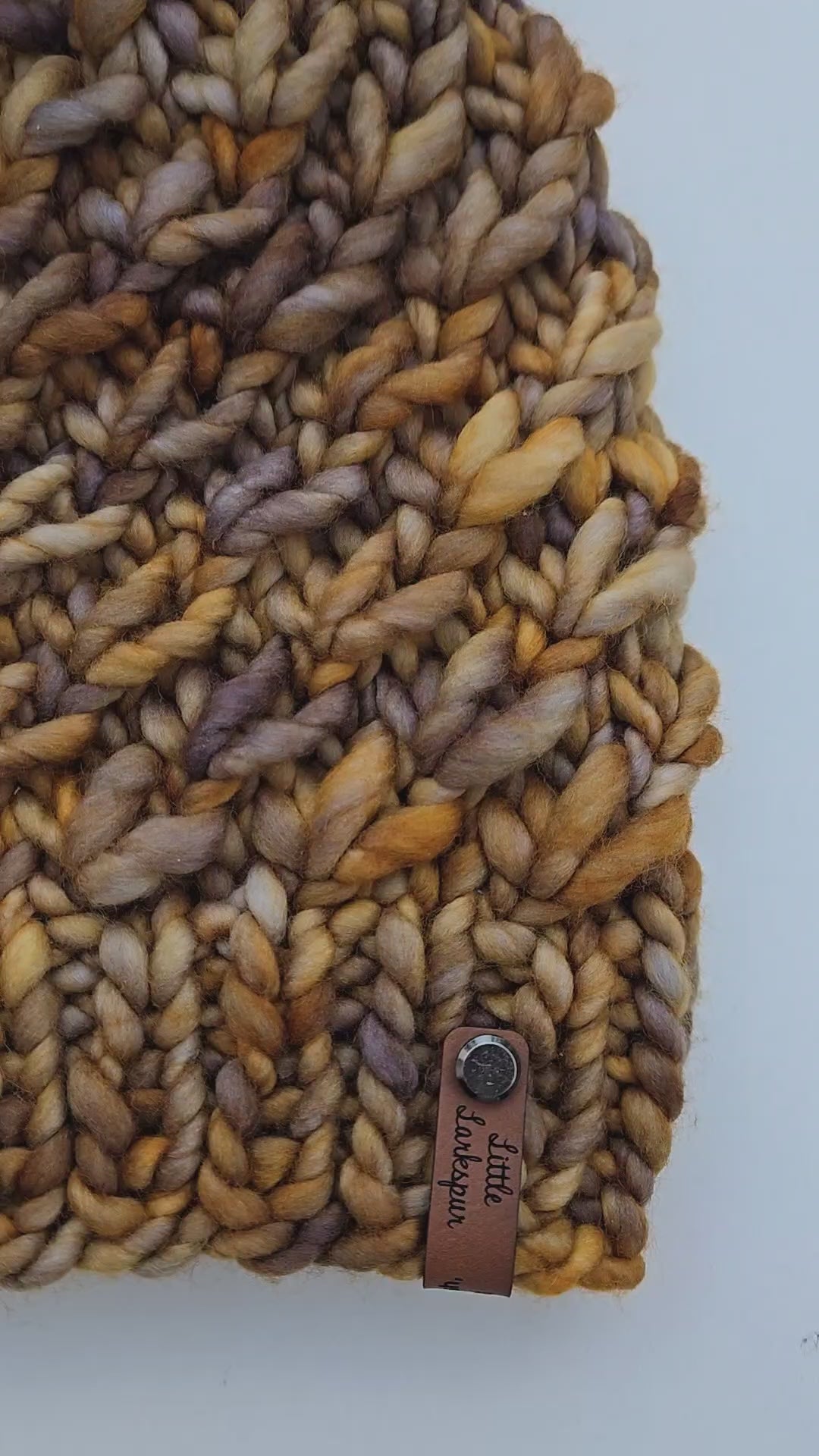 Luxurious Adult Crush Hat in a beautiful honey golden mocha brown colorway with a lovely faux fur pom pom and a faux leather tag