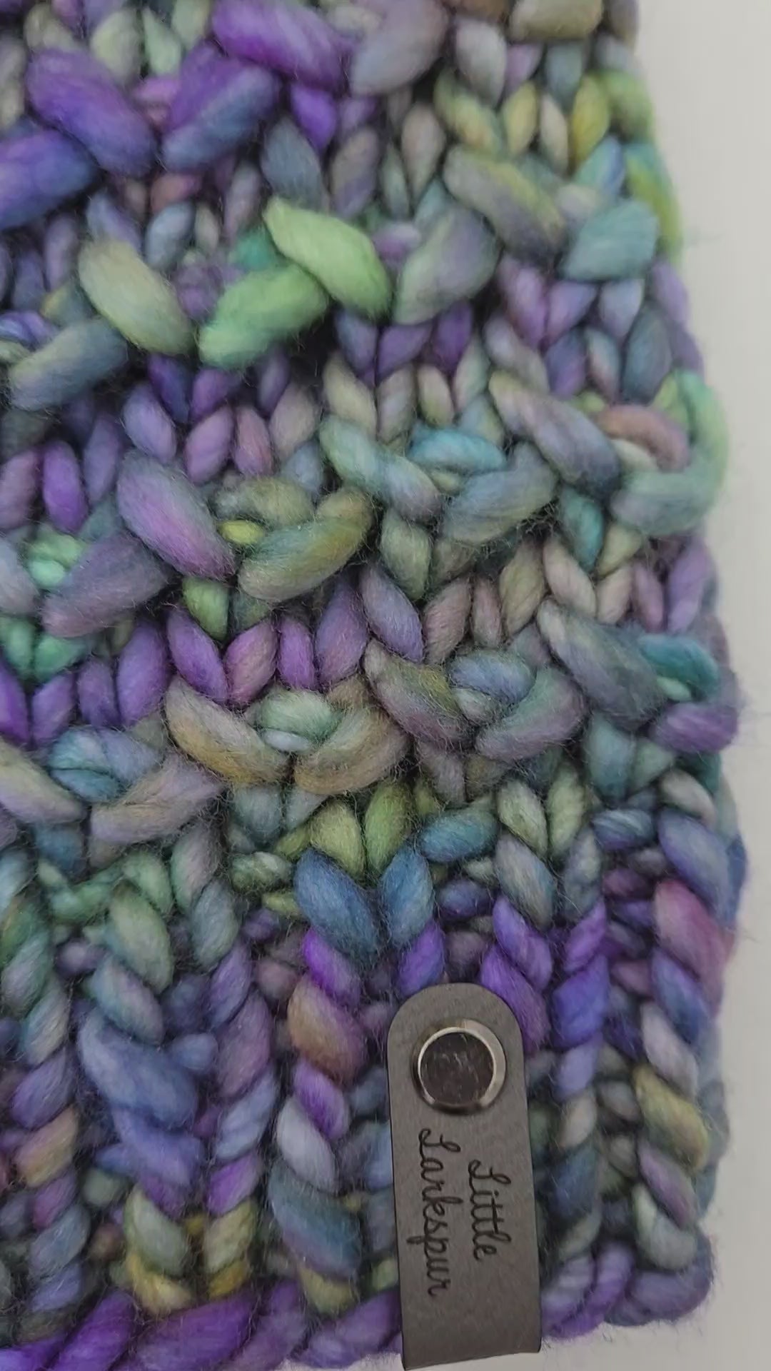 Luxurious Adult Hidden Pearls Hat in deep purple and blue colors and a vibrant faux fur pom pom with faux leather tag.