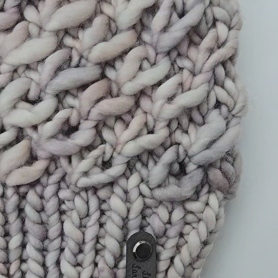 Before washing, untie pom pom and remove. When washing, use cool water with a gentle wool safe soap making sure to let it air dry.