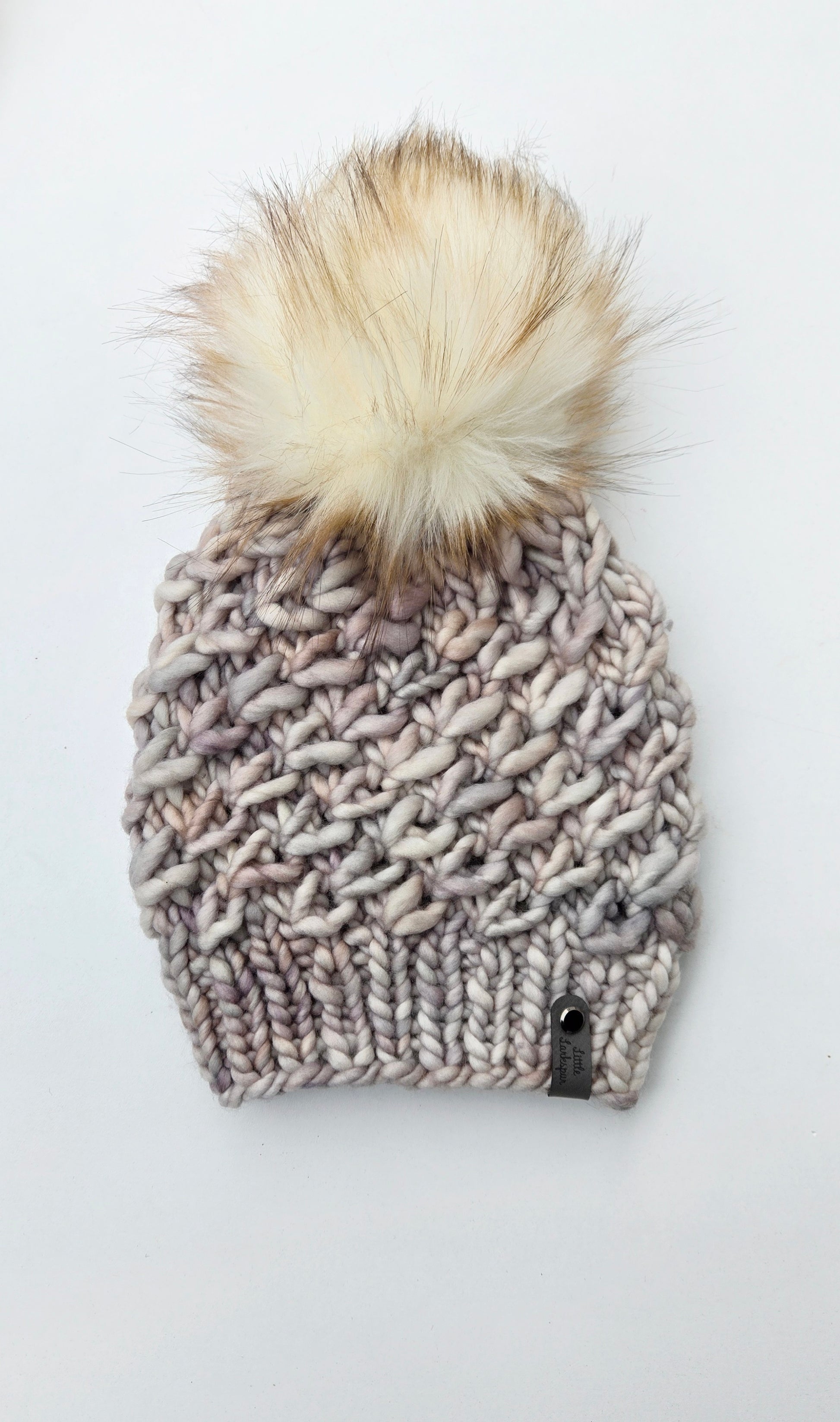 Luxurious Adult Crush Hat in a beautiful light brown neutral colorway with faux fur pom pom and faux leather tag.